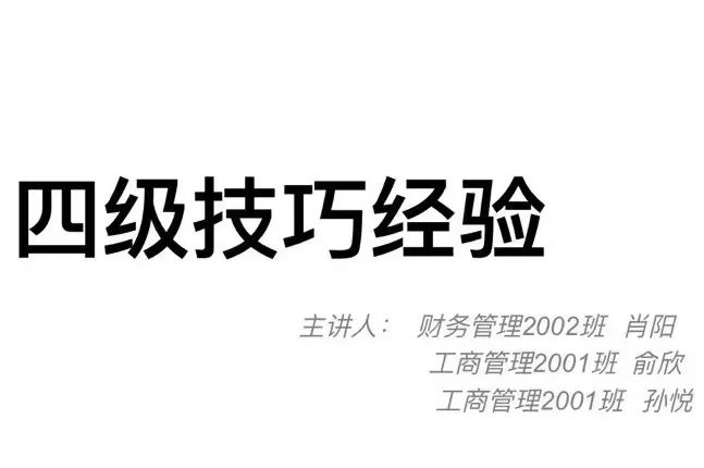本次活动邀请三位学习经验丰富、成绩优异的同学,分别是商2001俞欣,商2001孙悦和财2002肖阳,为大家分享英语四级考试经验。此次活动将会从复习迎考的心态和应试技巧以及注意事项等方面对大家进行讲解。且活动内容在详细解读CET-4考试考纲、题型的基础上,从听力、写作、阅读、翻译四部分入手,有针对性地解读试题易出现的陷阱,并推荐相关四级备考网站以提高同学们的英语成绩,为大家提供切实可行的备考策略。