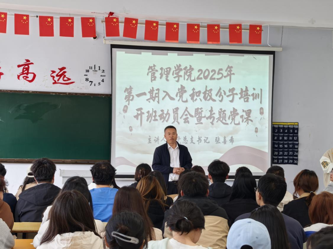 为进一步加强入党积极分子的思想教育,推动其深入学习党的创新理论,切实提升政治觉悟与组织纪律性,长春建筑学院管理学院于2025年5月19日中午11点40分,在104教室召开了管理学院2025年第一期入党积极分子培训开班动员会暨专题党课培训大会。管理学院党总支书记张喜希、学工党支部书记高铭彤带领全体学员参加了本次大会。