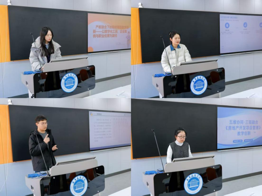 慕童老师主要为财务管理的教学进行设计,突破传统单一要素,用数字化工具落地实战案例,跟紧产业链与创业链,将理论与实践融合,建立可依托的“校企协同平台”。肖迪老师将AI赋能OBE教学革新带入管理学,利用AI对学生进行分层教学,实现个性化巩固,利用AI让学生的学习效率和教学质量都得到提高。朱松老师对建筑施工教学进行了改进,利用广联达虚拟施工系统与 Bimfilm 软件对本门课程进行助力,利用动画进行演示,让学生更加清楚的了解建筑施工的过程和检验流程。逄旭老师通过五维协同和三链融合,对房地产开发项目管理进行教学创新,通过对核心课程的讲解,以真实项目为载体,打破传统壁垒,实现从知识灌输向能力塑造转变,结合未来优化方向进行改革教学方式。郝仪兰老师将OBE技术带入会计学原理,利用实践性和管理性相结合的方法设定教学目标,将会计工作走进课堂,将复杂的概念形象化组织跨学科知识交流活动。
