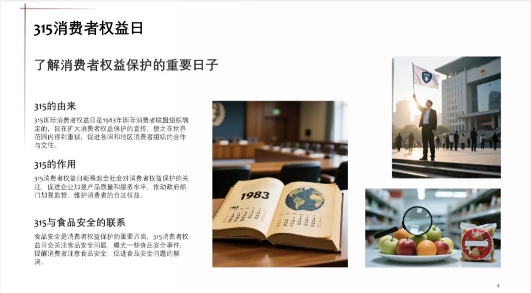 活动伊始,张晓芝老师以“红色铸魂守初心”为开篇,带领同学们回顾党的初心使命,从爱国主义、艰苦奋斗、开拓创新、集体主义的红色精神内核,再到革命先辈的光辉事迹,引导同学们在历史中感悟信仰力量。张老师强调,青年学子要将红色精神融入日常,坚定理想信念,增强时代责任感,在新时代征程中勇担使命。随后,张晓芝老师结合315消费者权益日,从个人健康、社会稳定、国家发展三个维度,解读食品安全的重要意义。倡导同学们树立健康饮食观念,理性消费,自觉抵制劣质食品。