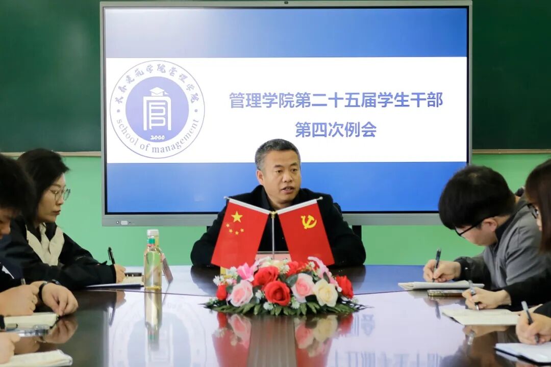 为进一步加强学生干部队伍建设,明确下一阶段工作方向,长春建筑学院管理学院于2026年4月7日中午11:40,在管理学院教学楼503会议室召开部长工作例会。党总支书记张喜希书记,分团委负责人高铭彤老师,以及团委学生会各部门部长共同参会。